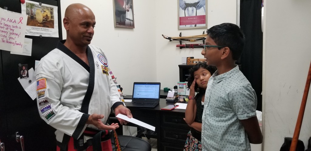 Then happened the big move for us from the UK to the US. All Indi asked was a similar Tang Soo Do Institute, and Jeff and Mick guided us to Austin Karate Academy run by Master Mukherjee. With slight changes in his forms, he graded every time he is due and soon was a blue belt. With the India trip last year, he had to wait for one extra year to give his black belt test, and he did! In this journey, he inspired many children to try this martial art, and more importantly, he achieved what neither his mum nor dad has!